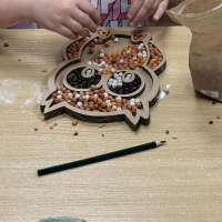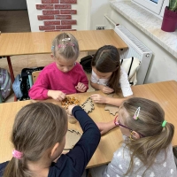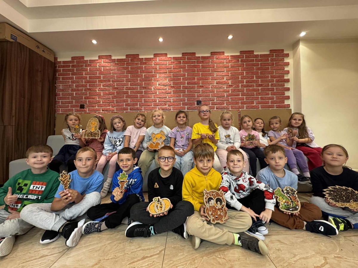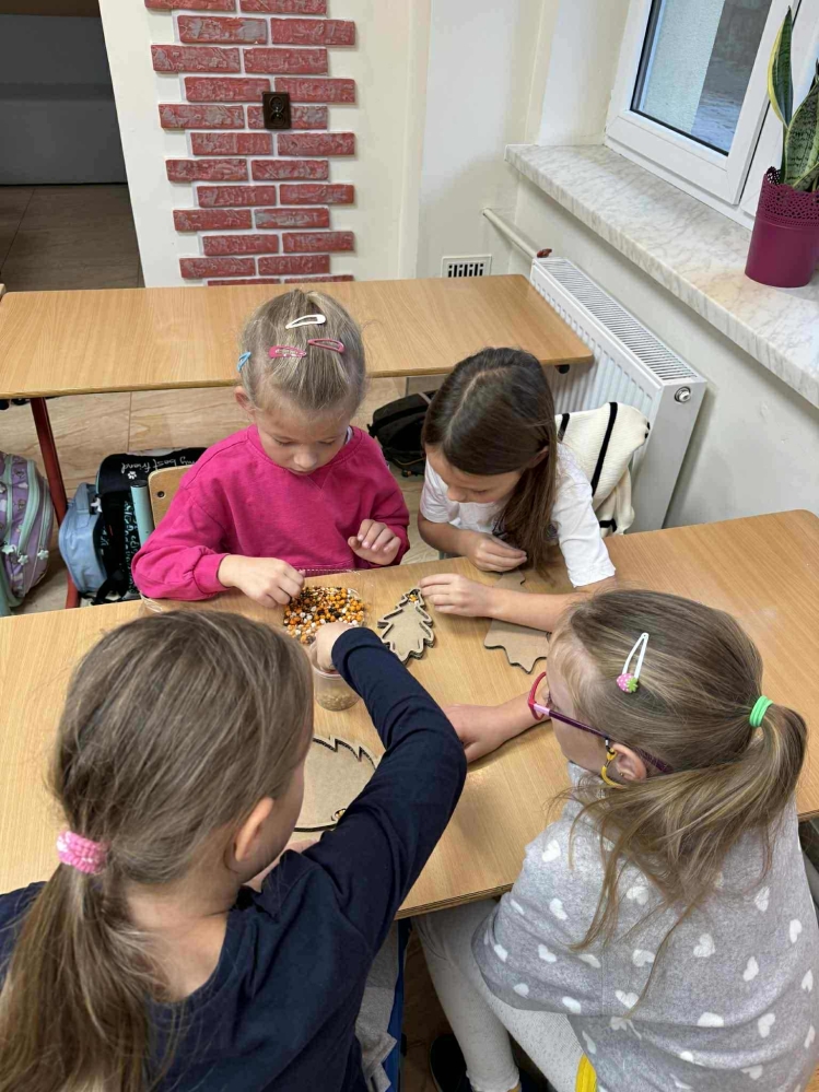 Jesień w klasie pierwszej!29 września odbyły się wyjątkowe zajęcia sensomotoryczne.Pierwszoklasiści otrzymali kartonowe szablony w kształcie jesiennych liści i zwierzątek, które wypełniali kolorowymi ziarenkami – grochem, fasolą, ryżem i innymi skarbami natury.Podczas pracy dzieci rozwijały sprawność manualną i motorykę małą, ćwiczyły cierpliwość, precyzję i koncentrację oraz uczyły się współpracy i dobrej organizacji.Efekty są zachwycające – jesienne dekoracje zdobią ich salę i przypominają, że ta piękna pora roku już zagościła na dobre.